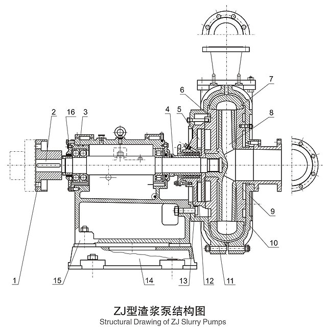 Coupling Shaft Bearing housing Disassembly ring Expeller Rear liner plate Volute casing Lmpeller Front liner plate Front casing Rear casing Stuffing box Water-seal Base Support Adjusting bolts |